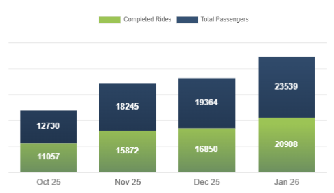 To meet this rising demand, the fleet expanded in January with the addition of seven new vehicles, bringing the total number of cars on the road to 42. This growth helps reduce wait times, improve service reliability, and expand coverage for riders throughout the county.
